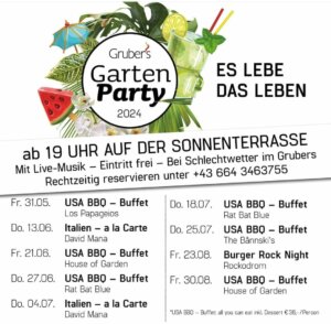 30.8.2024 19.00 Uhr Gartenparty Im Grubers Restaurant, Angerberg